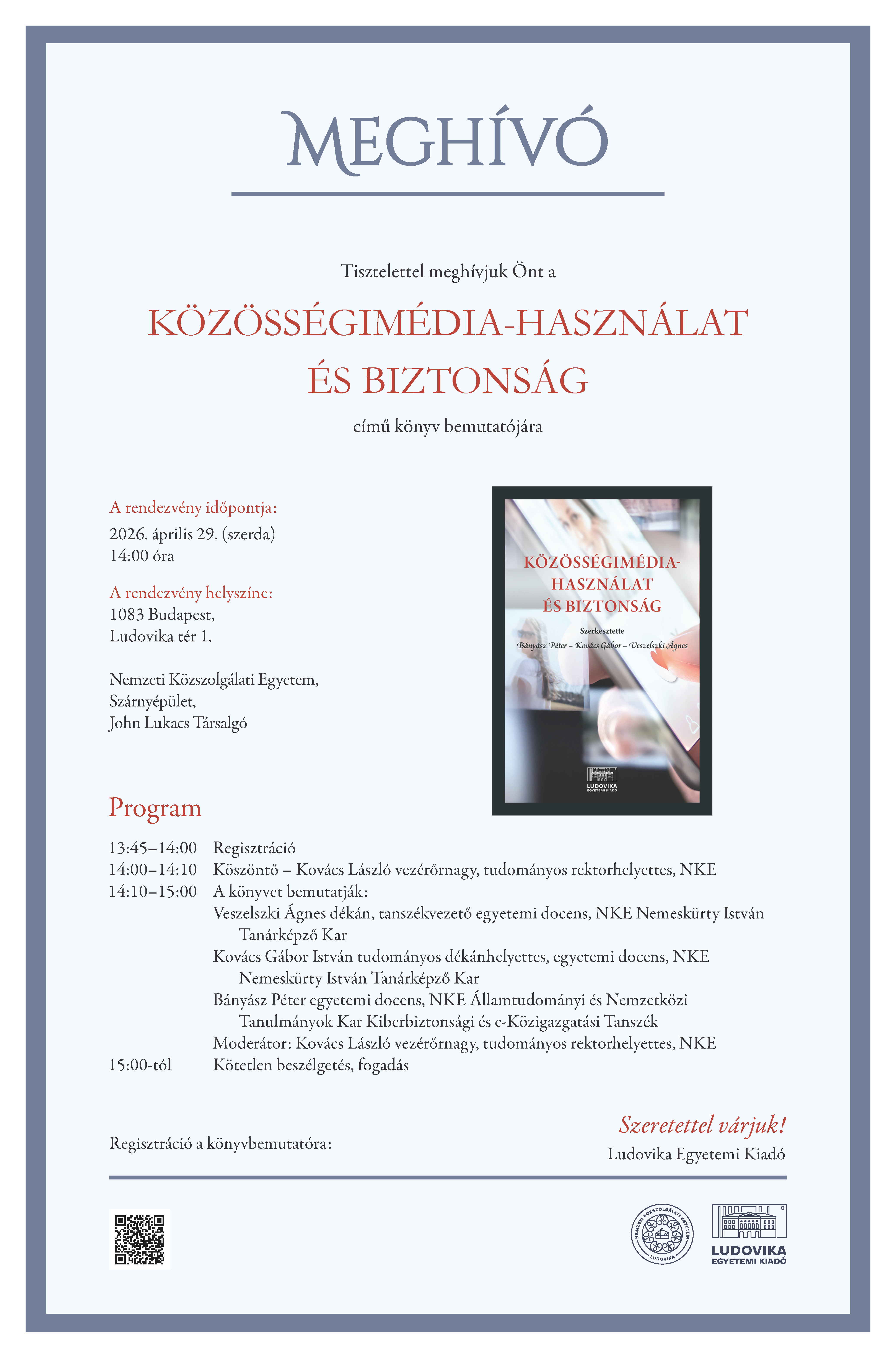 Bányász Péter, Kovács Gábor, Veszelszki Ágnes (szerk.): Közösségimédia-használat és biztonság című könyv bemutatójaPontszerző: 1 pont